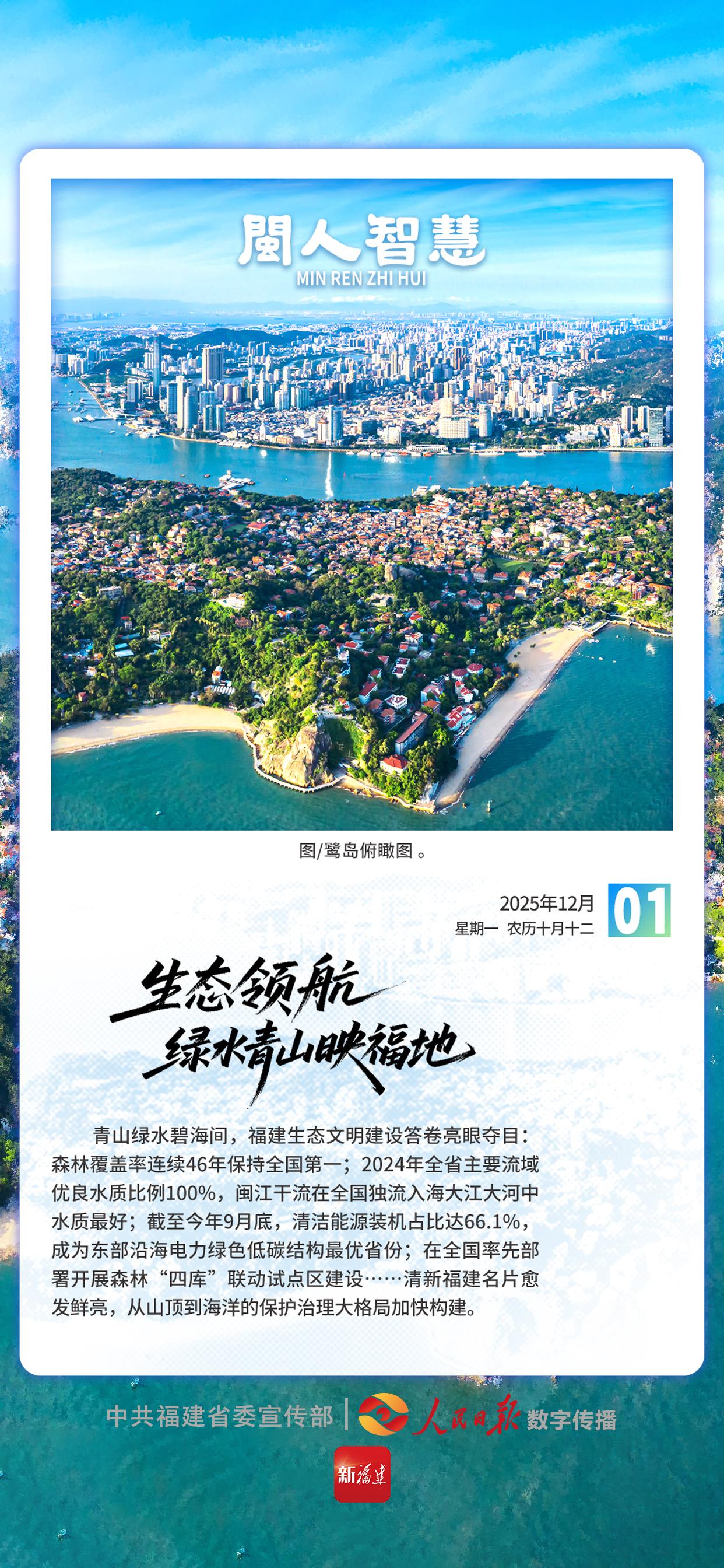 青山绿水碧海间,福建生态文明建设答卷亮眼夺目:森林覆盖率连续46年保持全国第一;2024年全省主要流域优良水质比例100%,闽江干流在全国独流入海大江大河中水质最好;截至今年9月底,清洁能源装机占比达66.1%,成为东部沿海电力绿色低碳结构最优省份;在全国率先部署开展森林“四库”联动试点区建设……清新福建名片愈发鲜亮,从山顶到海洋的保护治理大格局加快构建。