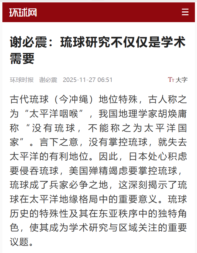 11月27日,环球网再度刊发福建师范大学中琉关系研究所所长谢必震教授署名文章《琉球研究不仅仅是学术需要》,文章指出琉球研究不仅是学术需求,更具有重要的地缘战略与历史价值。