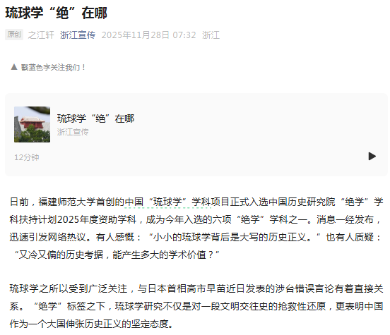 11月28日,“浙江宣传”微信公众号发表“琉球学‘绝’在哪”一文,围绕琉球学入选“绝学”的意义,提及该学科核心成果集中于福建师范大学30年的积累。