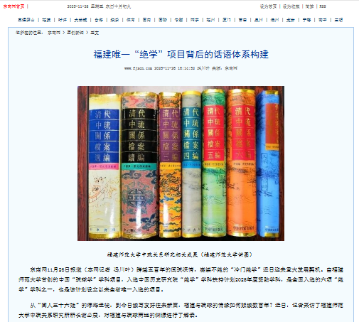 11月26日,东南网报道“福建唯一‘绝学’项目背后的话语体系构建”一文,突出“琉球学”作为福建唯一“绝学”项目的特殊地位,采访了福建师范大学谢必震教授,对福建与琉球两地的渊源进行了解读,重点阐释其在构建相关学术话语体系、挖掘区域文化内涵中的核心作用。