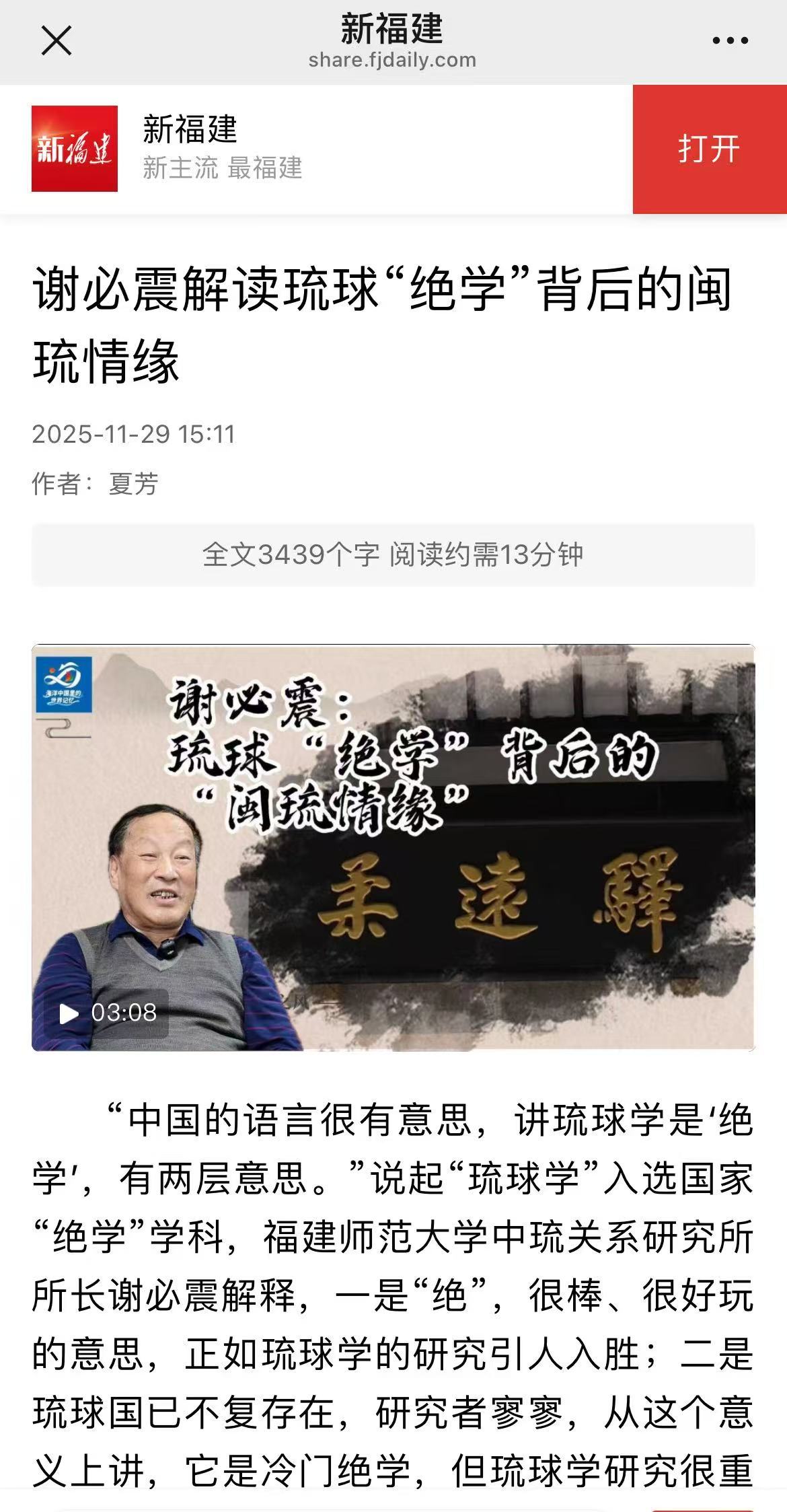 11月29日,新福建客户端发布“谢必震解读琉球‘绝学’背后的闽琉情缘”一文,走进福建师范大学中琉关系研究所所长谢必震教授的书斋,探寻“绝学”背后的闽琉情缘。