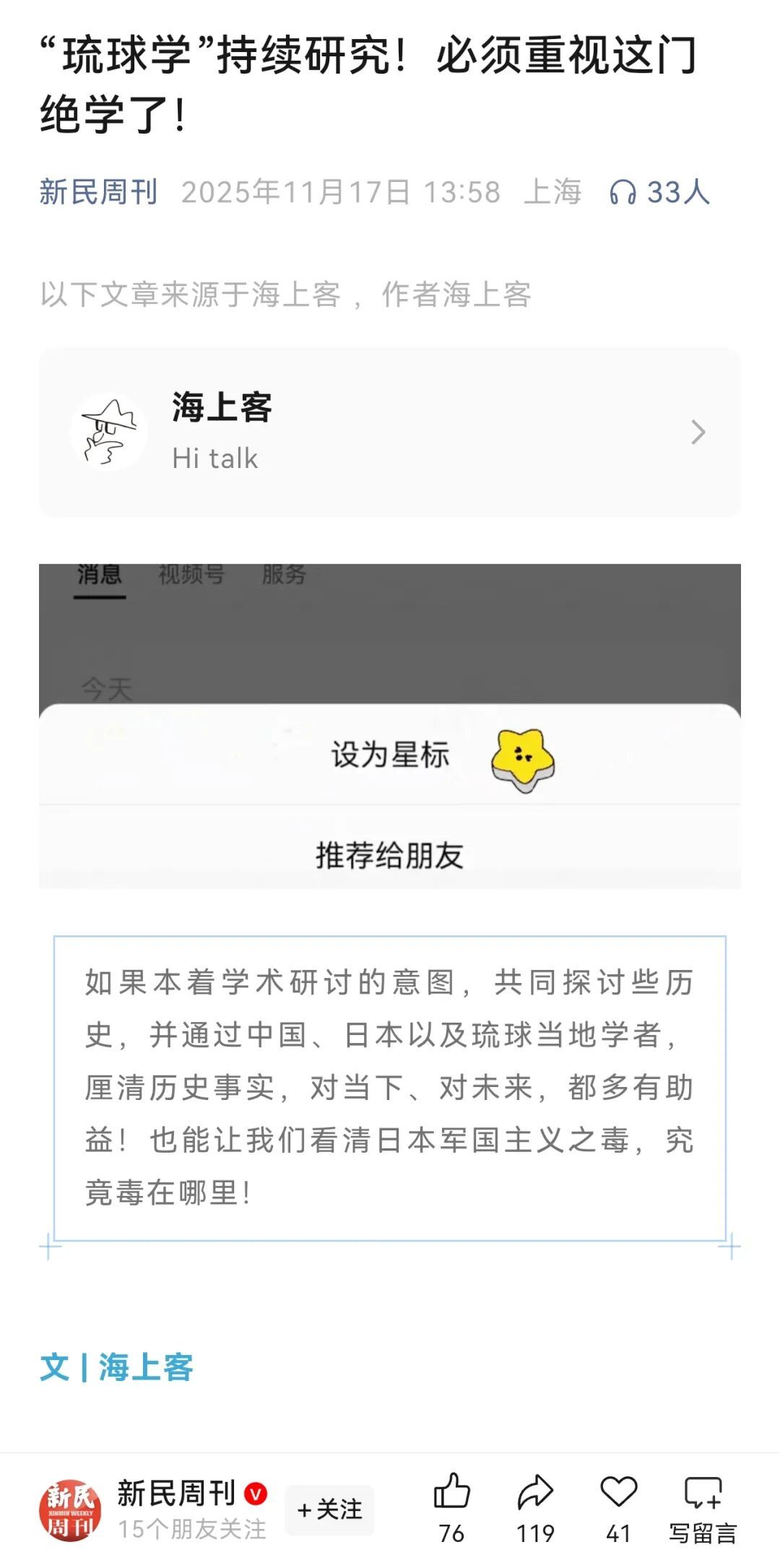 11月17日,“新民周刊”微信公众号“‘琉球学’持续研究!必须重视这门绝学了”一文,从学术研讨出发,强调“琉球学”应引起重视的观点。《新民周刊》同步转发该文章。