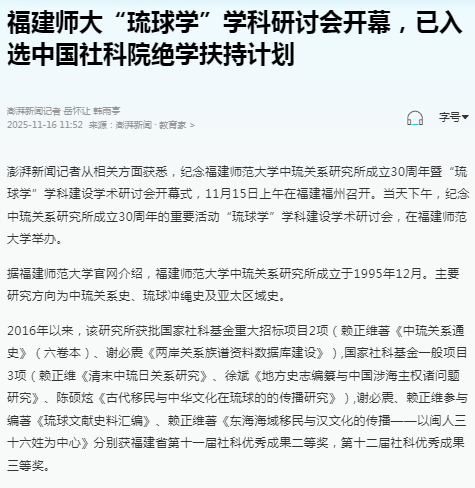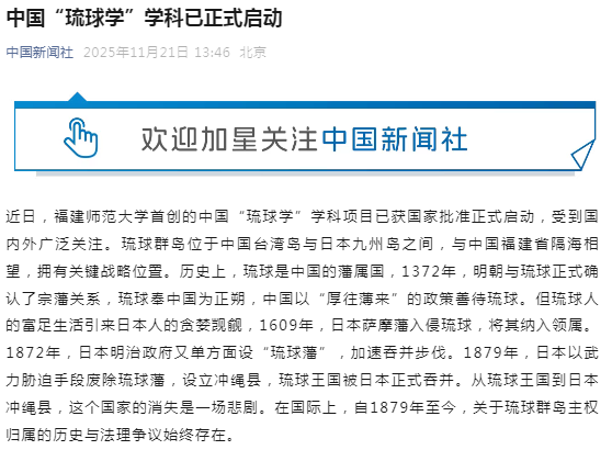 11月21日,“中国新闻社”微信公众号“中国‘琉球学’学科已正式启动”一文,以福建师范大学首创中国“琉球学”学科项目开篇,系统溯源了琉球历史以及中琉的交往情况。