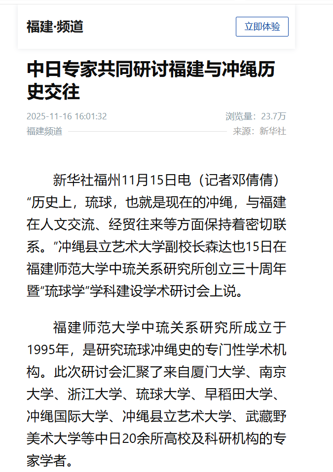 11月16日,新华社客户端以“中日专家共同研讨福建与冲绳历史交往”为题,报道了双方多年来的学术交流情况。