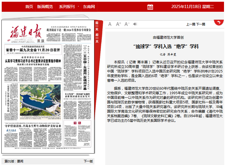 11月18日,《福建日报》头版以“‘琉球学’学科入选‘绝学’学科”为题,突出该学科的国家级认可地位,明确其作为全国六项“绝学”学科之一的稀缺性。