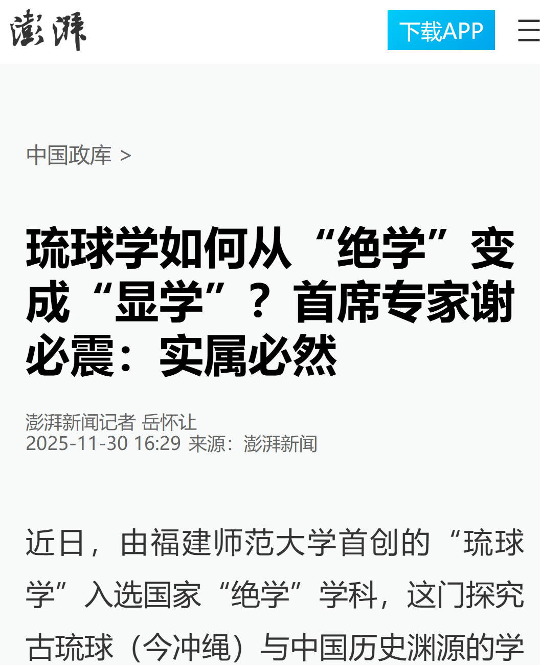 11月30日,澎湃新闻客户端综合多方报道刊发“琉球学如何从‘绝学’变成‘显学’?首席专家谢必震:实属必然”一文,从历史传承、现实价值以及学科建设、国家支持等揭示“琉球学”从“绝学”到“显学”的必然性。