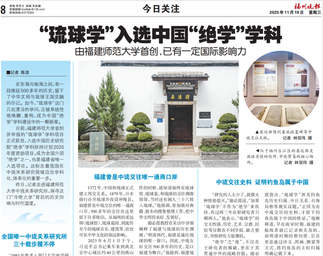 11月19日,《福州晚报》以“‘琉球学’入选中国‘绝学’学科”为题,整版报道采访福建师范大学谢必震教授,聚焦学科研究背后的历史脉络、研究成效、现实意义与国际影响。