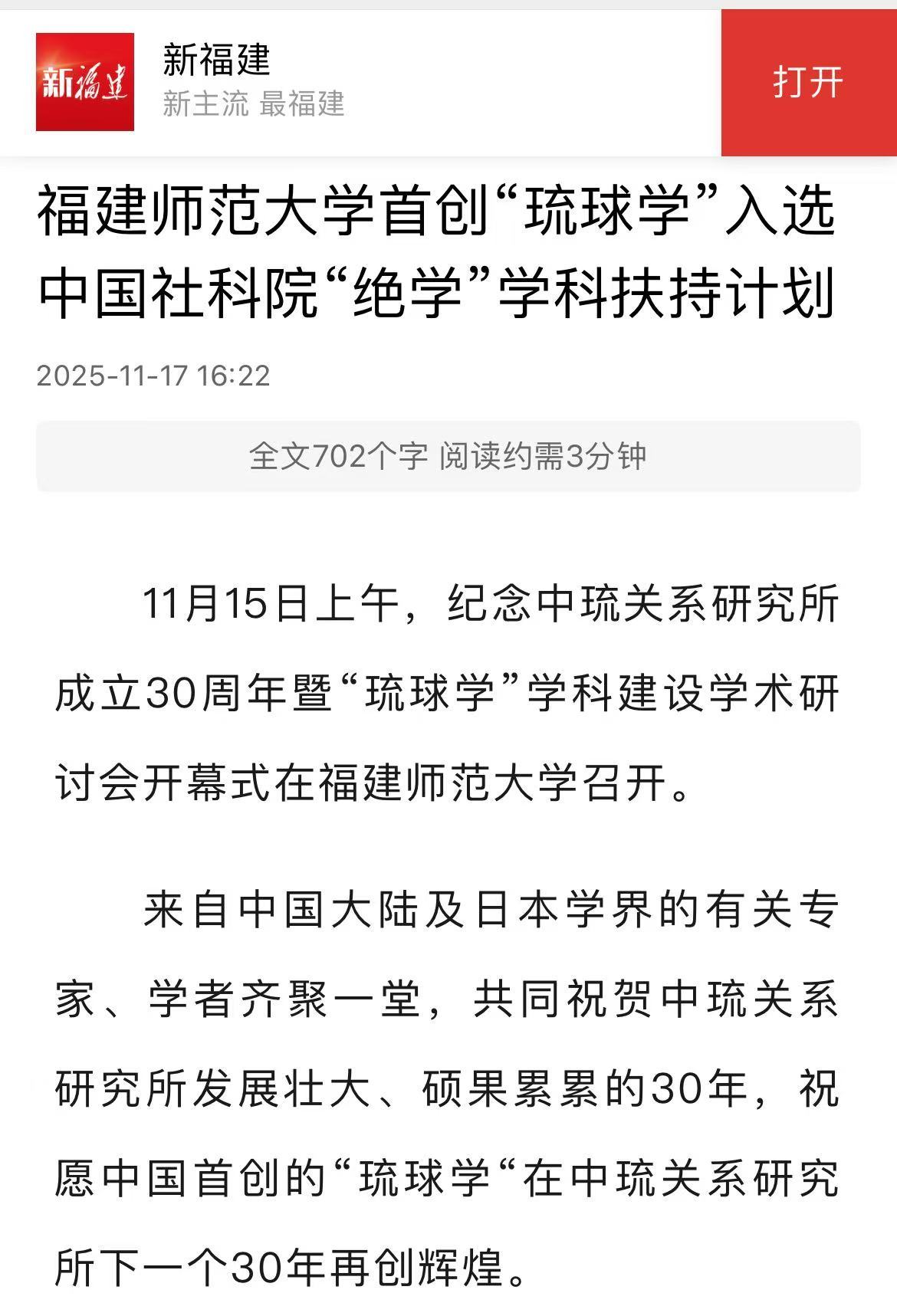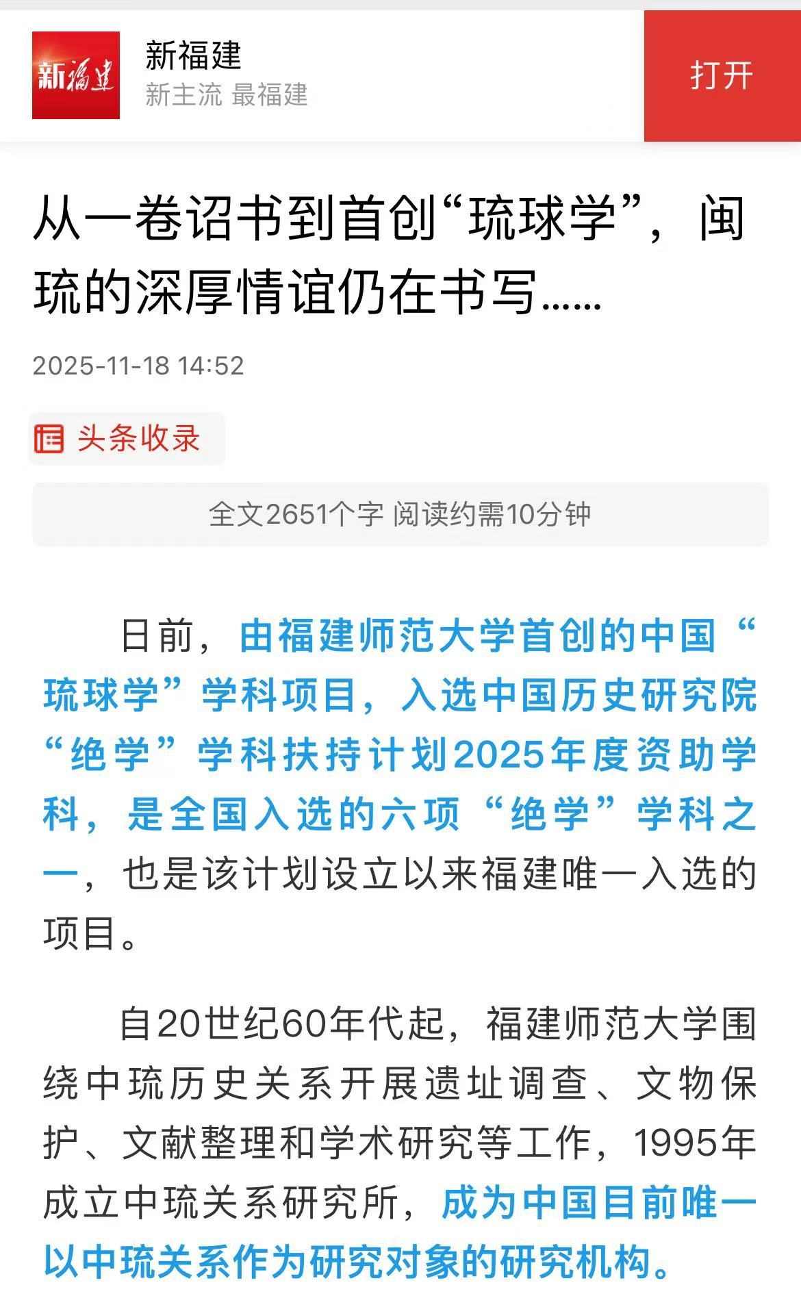 日前,福建师范大学首创的中国“琉球学”学科项目正式入选中国历史研究院“绝学”学科扶持计划2025年度资助学科,成为今年入选的六项“绝学”学科之一。该消息吸引多家主流媒体与平台深度关注,相关报道从学术价值、学科进展、地缘战略、历史贡献等方面展开,热议持续升温,形成强烈社会反响。