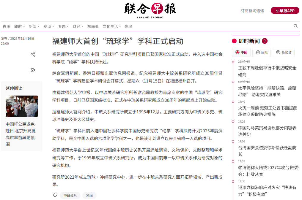 11月16日,联合早报网以“福建师大首创‘琉球学’学科正式启动”为题,关注学科正式启动的关键节点,传递中国“绝学”研究的新进展。