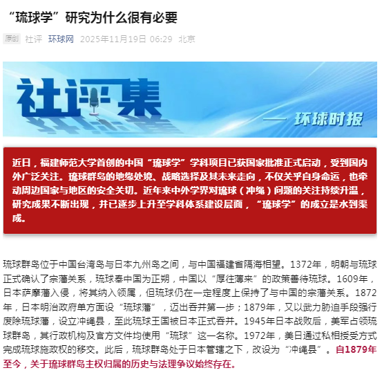 11月19日,环球网刊发《环球时报》社评“‘琉球学’研究为什么很有必要”,以福建师范大学首创的中国“琉球学”学科项目获批为背景,指出近年来中外学界对琉球(冲绳)问题的关注持续升温,研究成果不断出现,并已逐步上升至学科体系建设层面,认为“琉球学”的成立是水到渠成。中国网同步转发该社评。同日,由环球网主持的话题“‘琉球学’研究为什么很有必要”位居百度热搜榜第41位。