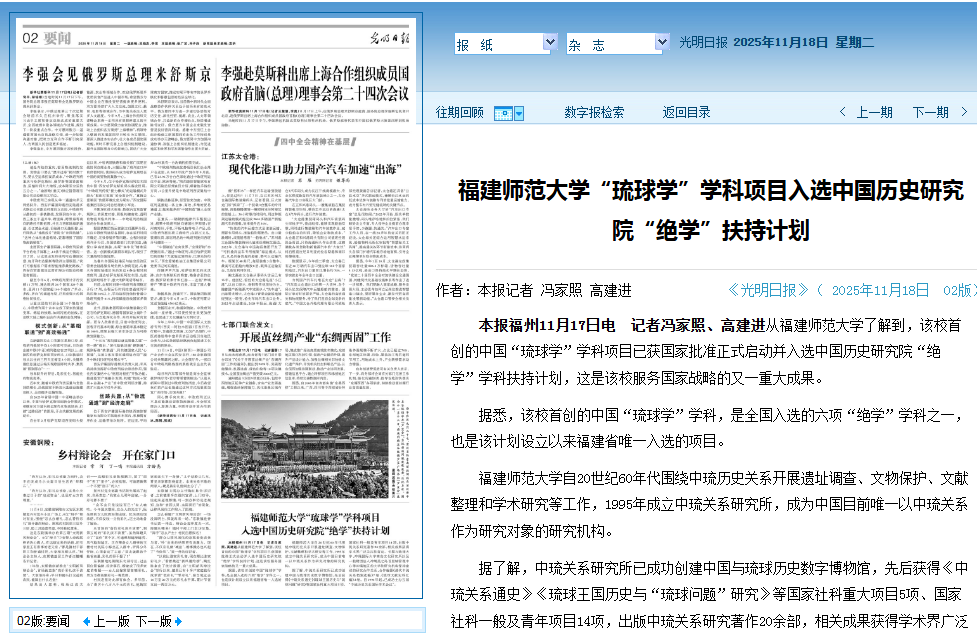 11月18日,《光明日报》02版以“福建师范大学‘琉球学’学科项目入选中国历史研究院‘绝学’扶持计划”为题,追溯至上世纪八十年代,福建师范大学学者率先开展中琉关系史研究,逐步积累丰硕成果。