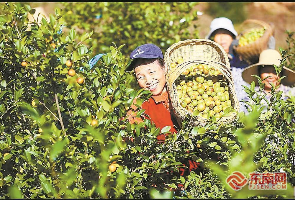 在京口村的油茶基地,种植户黄赫东正清点着工人刚采摘的茶籽,筐筐饱满的果实堆成了小山。“今年采摘了8天,每天要雇70到80个本地熟工,他们能精准分辨成熟茶果,还能保护茶树不受伤。这些茶果烘干后,用货车运到安溪的加工厂榨油,泉州、厦门的客户都认大田茶油,订单排得满满当当,根本不愁卖。”黄赫东说。