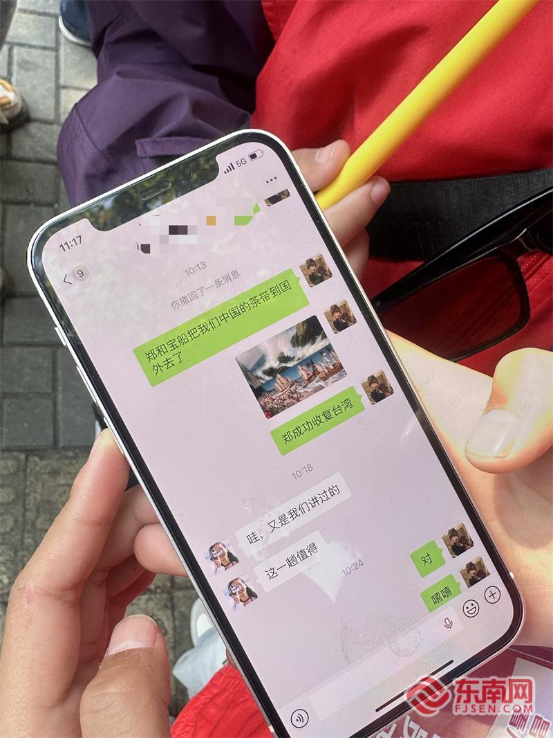 11月26日,在福建博物院,昌都市第一小学的卓嘎拉珍兴奋地向昌都老师“直播”博物馆内的郑成功收复台湾的相关展品。