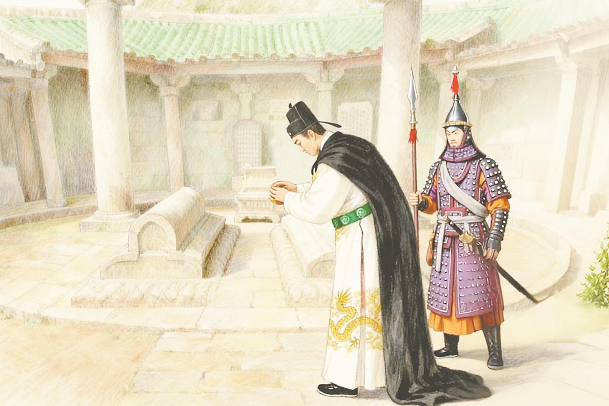 明永乐十五年,航海家郑和第五次下西洋前,专程到灵山圣墓行香进谒、祈求庇佑。(福建日报社全媒体传播中心AI制图)