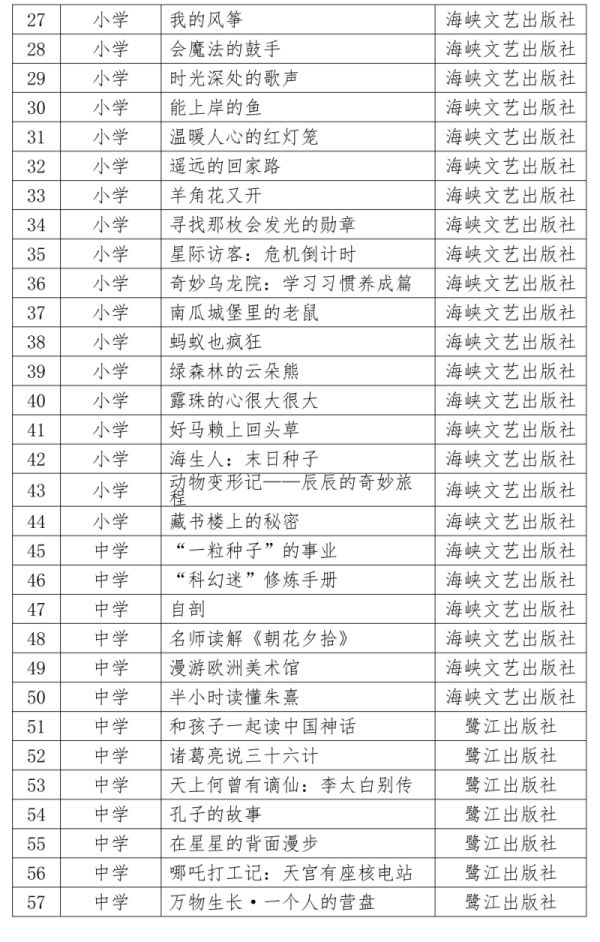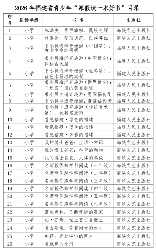 东南网12月5日讯(本网记者 谭佩)书香浸润时光,阅读点亮未来。2026年福建省青少年“寒假读一本好书”活动即将启动。近日,福建省全民阅读促进会组织专家编制并发布了《2026年福建省青少年“寒假读一本好书”目录》,共选定优秀图书57种,其中包括小学阶段推荐图书44种,中学阶段13种。