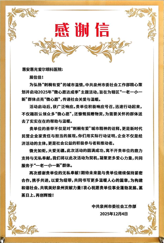 惠光爱尔眼科医院荣获市委社会工作部"感谢信"