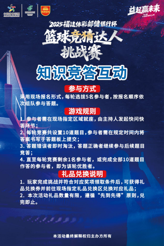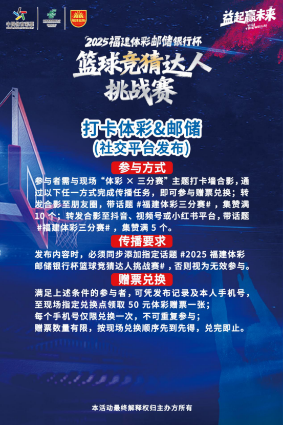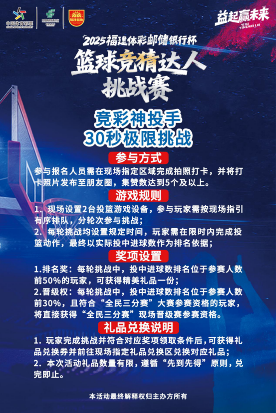 2025年12月6日,一股篮球热潮即将席卷福州!由福建省体育彩票管理中心、福建省篮球协会联合主办,中国邮政储蓄银行福建省分行协办的“2025福建体彩邮储银行杯篮球竞猜达人挑战赛暨全民篮球福建省大众三分球投篮争霸赛(体彩专场)”北赛区晋级赛,将在万象夺幕篮球场火热开战。
