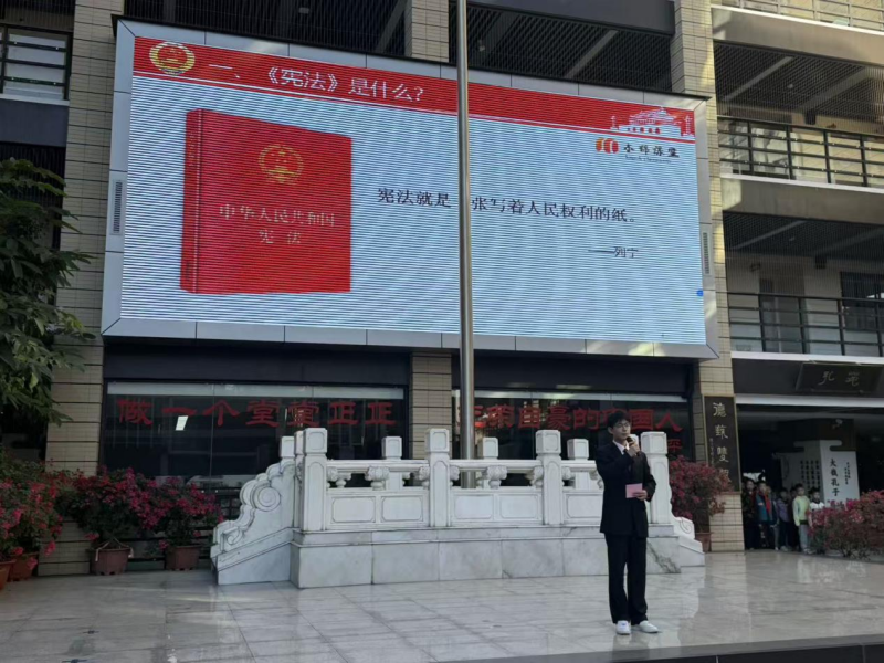 12月1日,晨光熹微,鼓楼区第二中心小学操场上传来朗朗诵读声。全体师生在雄壮的国歌声中肃立,随后开启一场特殊的“宪法晨读”。高校法治特派员林子恒以“宪法如大家长”的生动喻体,深入浅出阐释宪法与国旗、国歌的内在联系,让根本大法的崇高地位在孩子们心中扎根。全体师生齐声诵读宪法核心条款,抽象的法律条文化作具象的生活信念,在晨光中凝聚成尊法守宪的共识。“这种充满仪式感的教育,让宪法‘声入人心’,真正实现了从‘知法’到‘信法’再到‘守法’的认知跨越。”鼓楼区人民检察院检察官李楠评价道。