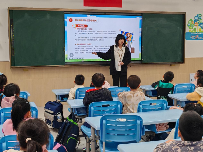 12月3日,福州市延安未来学校的课堂变身法治探索乐园,四个班级的学生沉浸式参与普法活动。高校法治特派员宋昱岑、林煜凯创新运用“听、看、演、议”四维教学法,通过宪法小故事启迪思辨、主题漫画直观解读、“班级模拟选举”亲身体验、班级事务民主讨论等形式,让孩子们在趣味互动中明晰权利与义务的边界。