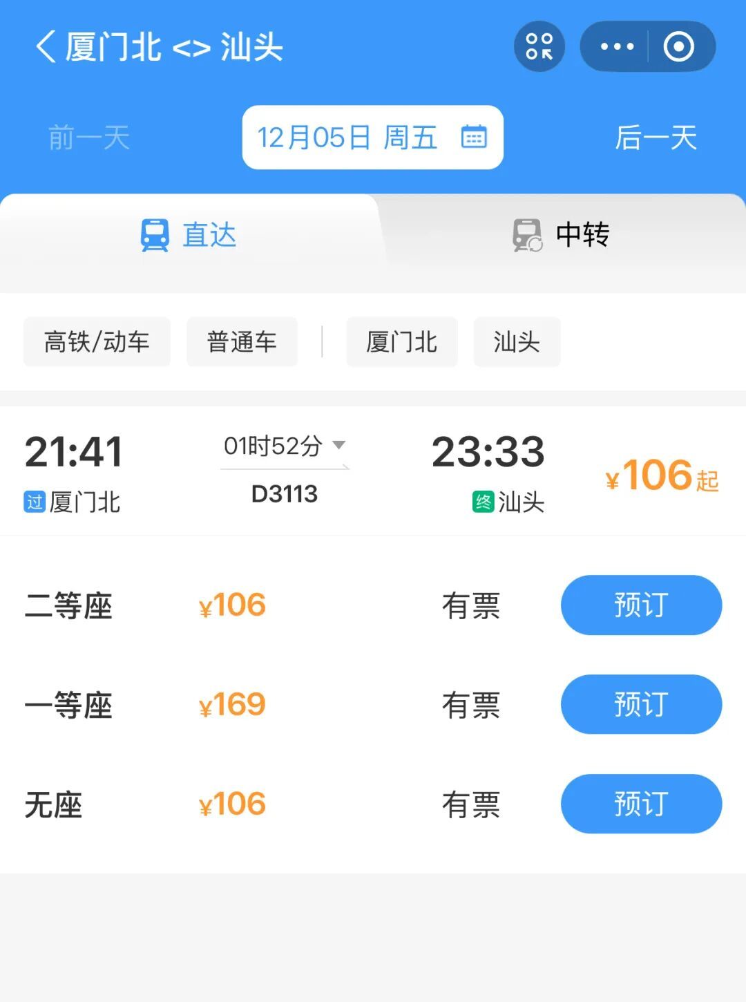 厦门 该趟列车21时34分经停厦门北站,抵达汕头站用时约1小时52分,二等票价106元。