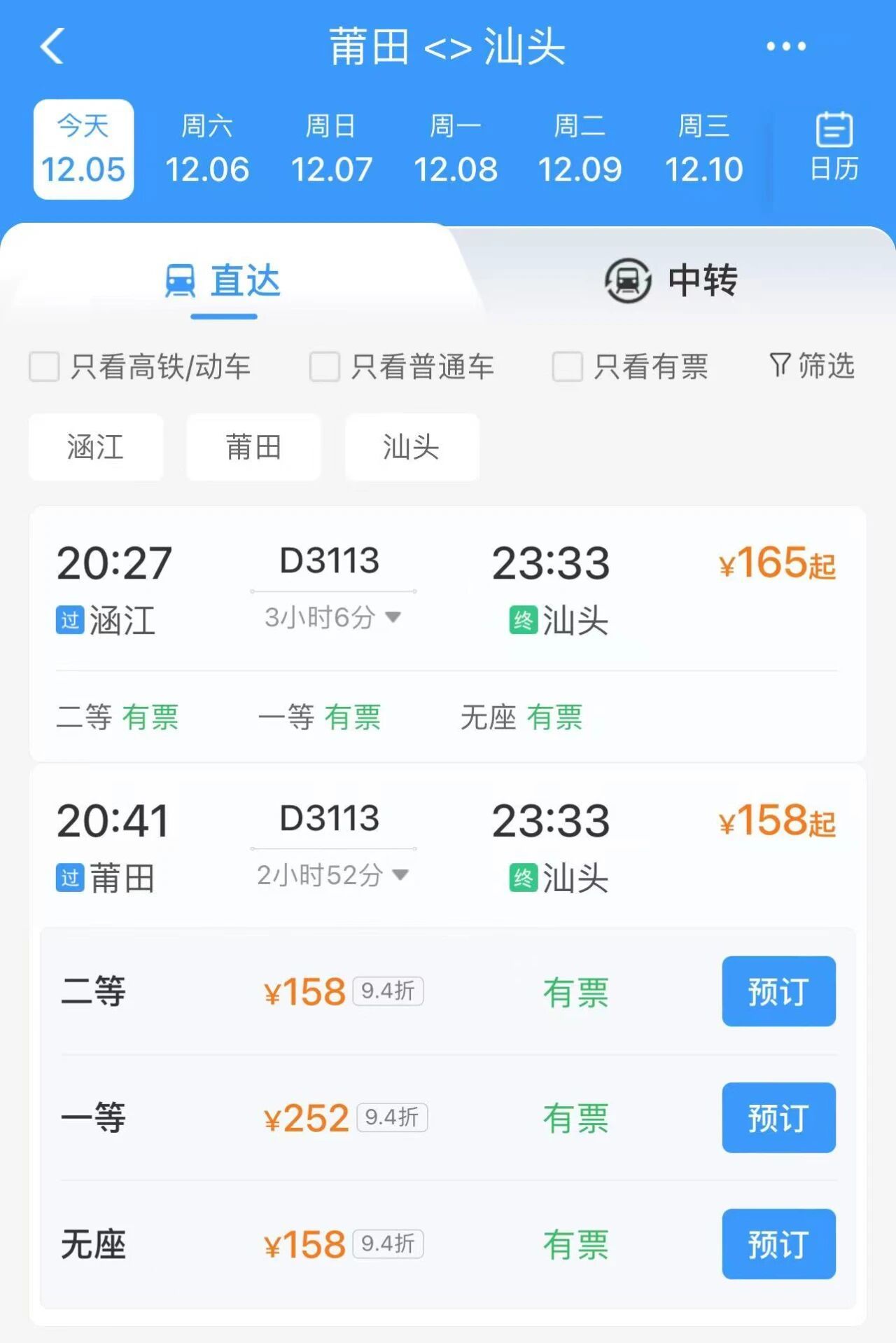 莆田 该趟列车先后经停涵江站、莆田站,抵达汕头站分别用时约3小时6分、2小时52分,二等票价分别为165、158元。