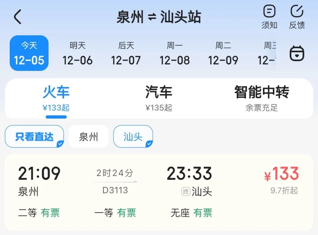 泉州 该趟列车21时07分经停泉州站,抵达汕头站用时约2小时24分,二等票价133元。