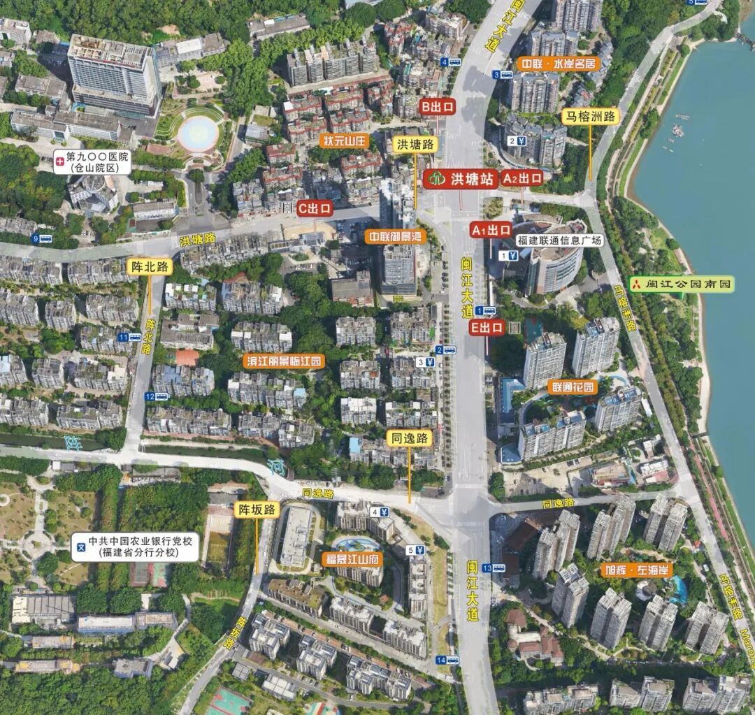 洪塘站位于闽江大道与洪塘路交叉路口南侧,沿闽江大道(南北向)布置,5号线设置A1、A2、E,3个出入口,4号线设置B、C,2个出入口。