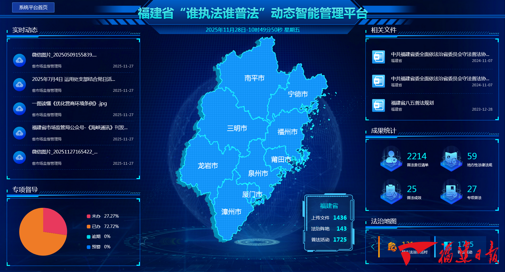 对此,福建锚定“法治福建建设先行示范”目标,将普法成效纳入党政“一把手”年终述职评议和绩效考核,按照“谁执法谁普法、谁管理谁负责、谁服务谁普法”原则,在全国率先以动态智能普法管理平台为工作中枢,以绩效考核为抓手,有效推动普治融合,打通了法治政府和法治社会建设的桥梁,从源头上解决法治建设“最后一公里”问题:“谁来普?”“普什么?”“怎么普?”