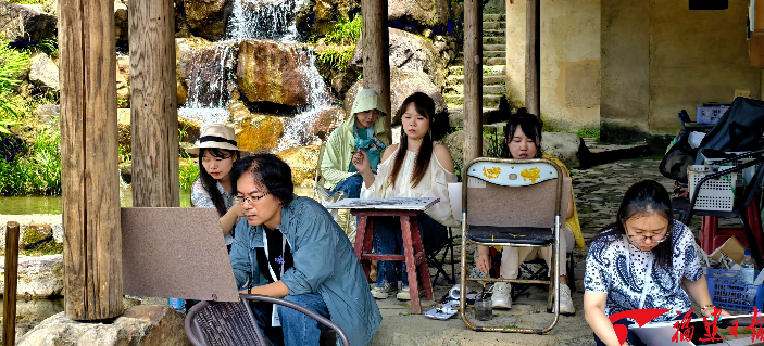 叠水飞瀑旁,数字游民在写生。 福建日报记者 郭斌 摄