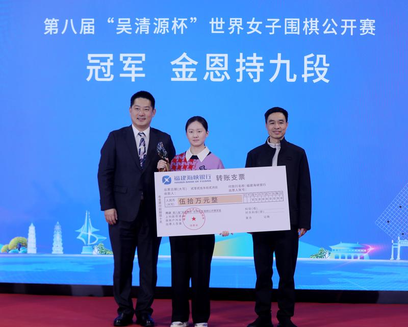 9日,中国围棋协会主席常昊(左一)和福建省体育局党组书记、局长叶得盛(右一)颁发第八届“吴清源杯”世界女子围棋公开赛冠军奖项。主办方供图