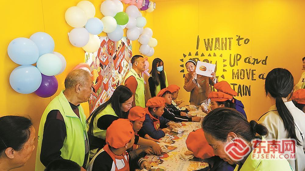 餐厅早已布置妥当,温馨的角落贴着“欢迎小天使”的手绘海报,员工提前接受了简单培训。在老师和员工引导下,孩子们轮流体验迎宾、点餐、DIY汉堡等环节。