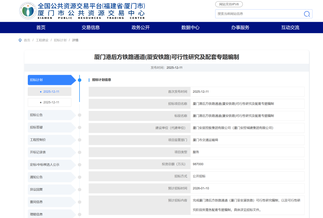 据厦门市公共资源交易中心消息,2025年12月11日,厦门港后方铁路通道(厦安铁路)可行性研究及配套专题编制公开招标,预计招标内容为完成厦门港后方铁路通道(厦门至泉州安溪铁路)可行性研究编制,以及可行性研究阶段所需各配套专题编制。