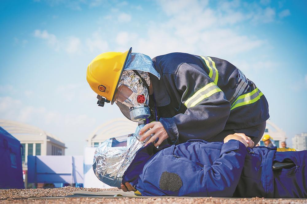 竞赛设置灭火救援、防火巡查、消防宣传实用技能等实战技能项目,综合考验了各乡镇队伍消防安全管理经验和应急处置技能。图为消防员为模拟伤员佩戴逃生面罩。 福建日报见习记者 李子衡 摄