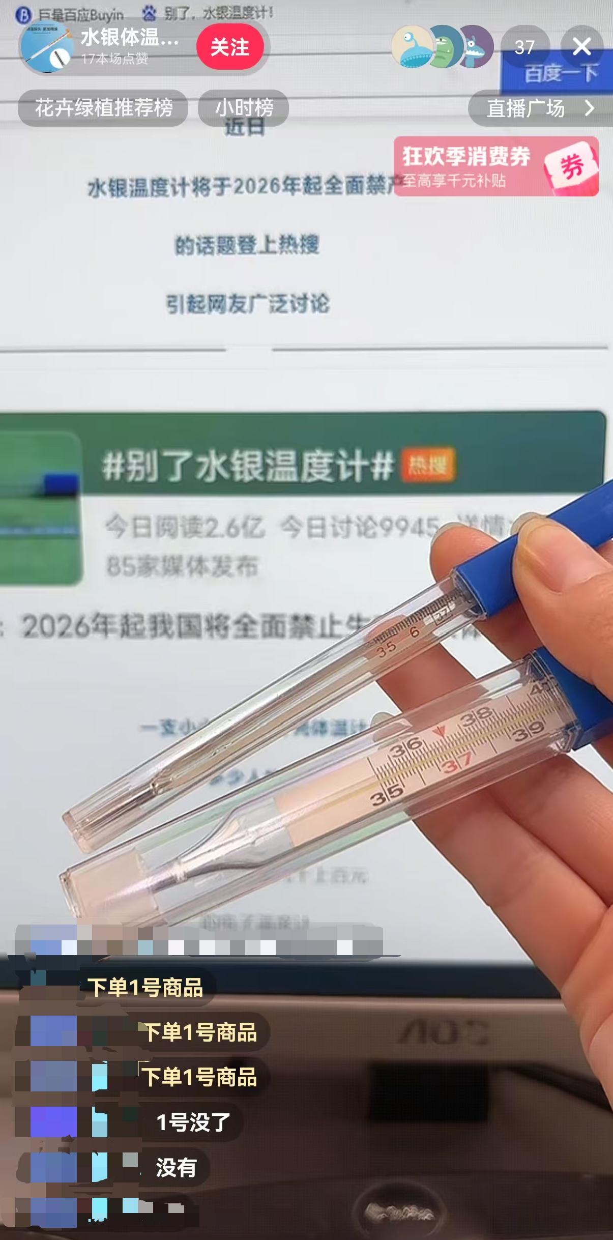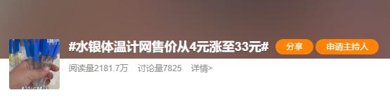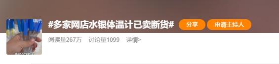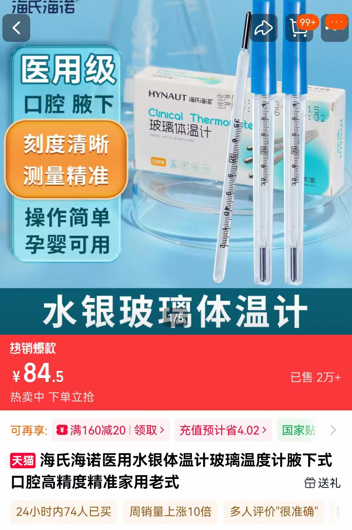 在电商平台上,近期水银体温计的销售也同样火爆。记者在某电商平台上看到,水银体温计已经被打上了"热销爆款"的标志。还有商家直播卖起了水银体温计,价格是一支9.9元。记者在直播间看到,下单购买的消费者不少。而在社交媒体上,不少网友晒出了自己的囤货,甚至有人囤了数十支。也有网友调侃,要将水银温度计当作传家宝,传下去。