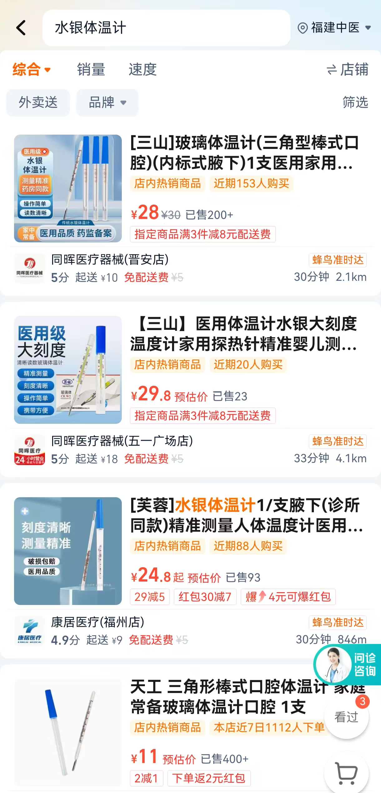 在外送平台的销售情况则略有不同。记者在淘宝闪购、美团买药、朴朴超市等本地配送平台查询发现,福州区域内的线上渠道水银体温计同样供不应求,部分商家出现断货或限购情况。个别线上店铺虽仍有库存,但价格已涨幅较大,一支水银体温计标价在20-30元。