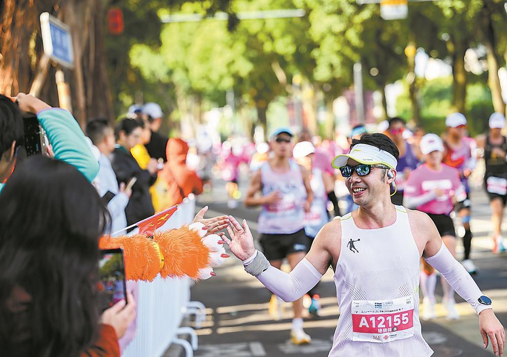 选手与赛道旁加油的观众击掌。 福建日报记者 施辰静 摄