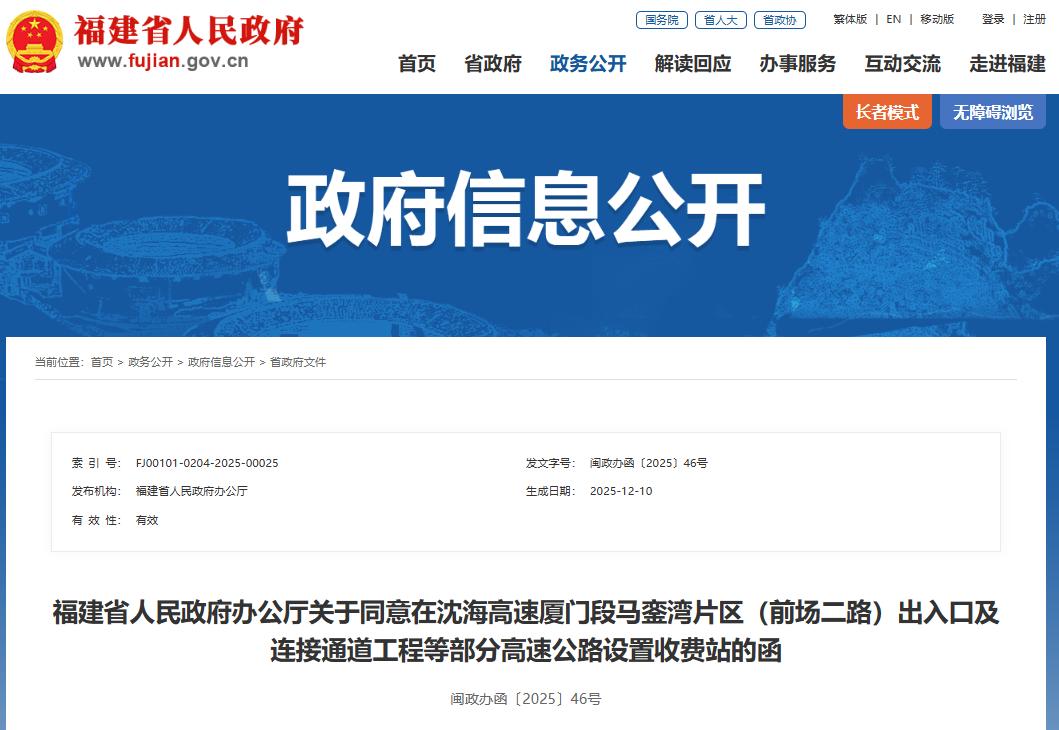 据悉,经省人民政府研究,同意在沈海高速厦门段马銮湾片区(前场二路)出入口及连接通道工程设置“厦门马銮湾”收费站,在宁武高速鹤山服务区A区出入口工程设置“古田鹤山”收费站,在泉南高速西洋服务区B区出入口工程设置“永安葛福”收费站,在长深高速小桥服务区B区出入口工程设置“建瓯甘源茶宿”收费站。收费站的建设必须符合国家、省关于公路收费站的相关要求,经验收合格后,方可投入使用。