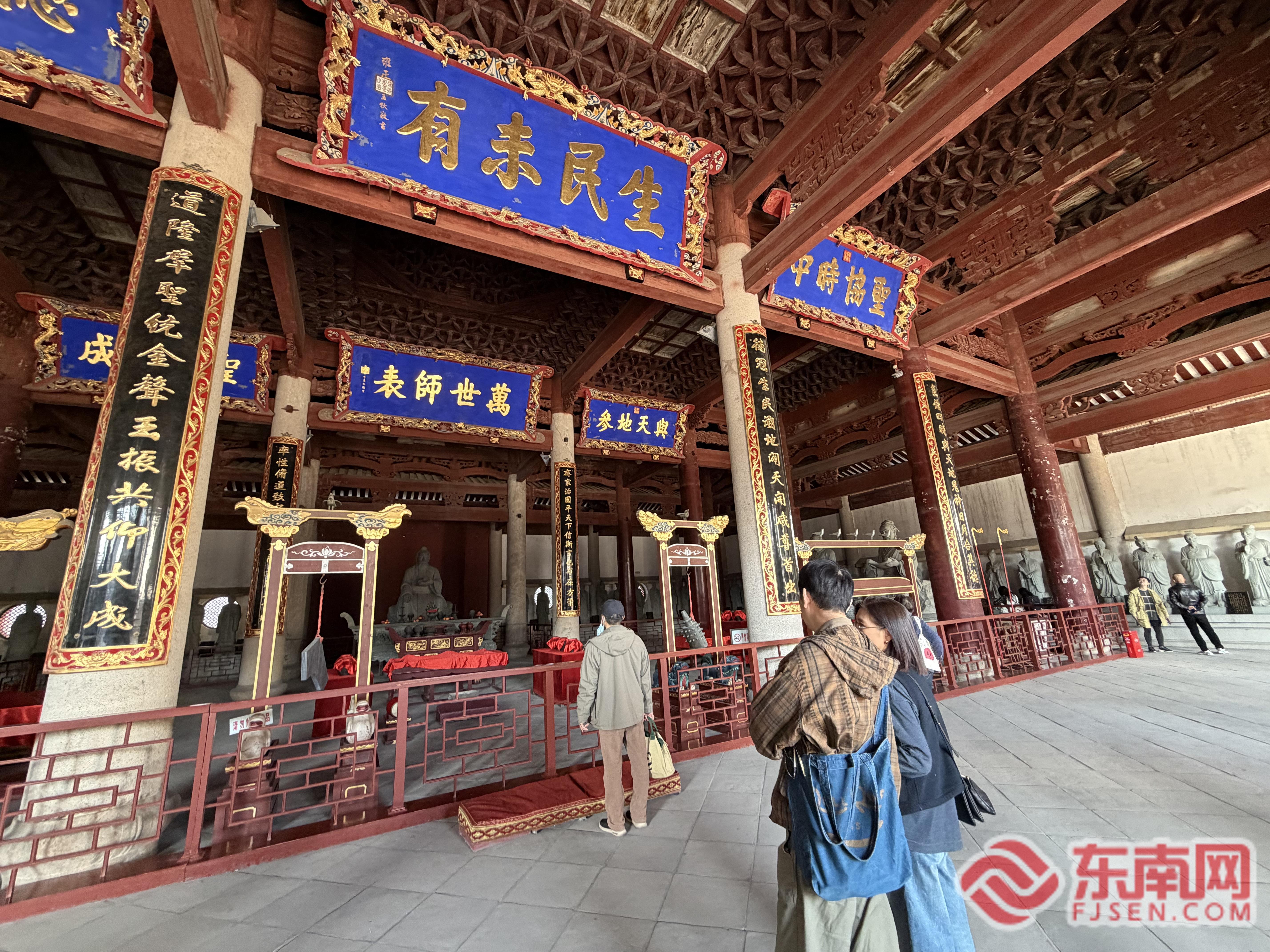 游客王婧正在参观殿内的孔子及七十二贤石雕像,她告诉记者:“这种规制在全国都少见,1300多年科举史里,福州16位文状元、12位武状元的故事,都能在这里找到印记。”