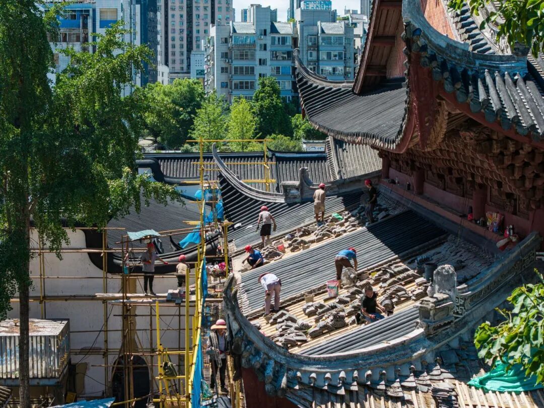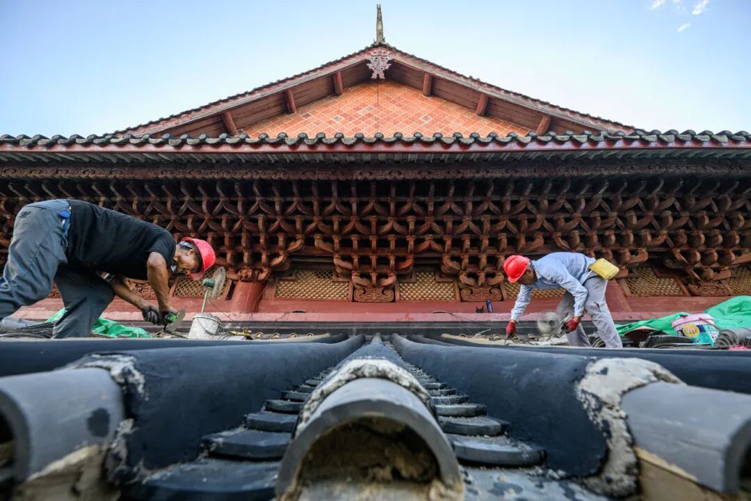 屋面修缮是此次工程的重点和难点,在福州本地文山古砖窑停烧之后,更是“难上加难”。“现在有很多合成材料烧制的瓦用于古建筑修缮,但是颜色和功能都难企及旧瓦,修缮大成殿用的瓦还是要延续本地工艺特性的。”邱守廉说,正在大家一筹莫展的时候,施工队揭瓦后发现,20世纪七八十年代修缮的那批瓦上留下了“宫辉砖瓦厂”的标志,这让大家欣喜若狂。