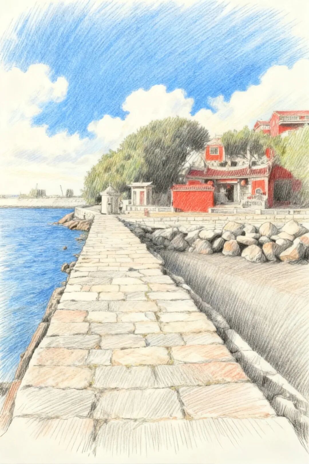 通济桥将岸边村落与前方的大礁石码头连接起来,方便人们从大礁石处停船登岸。(AI制图)