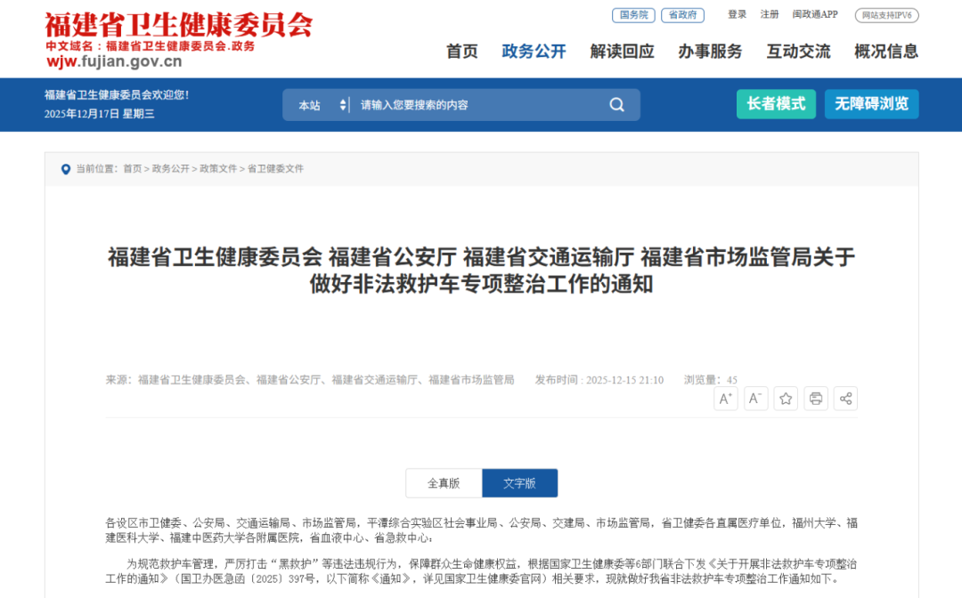 为规范救护车管理,严厉打击“黑救护”等违法违规行为,保障群众生命健康权益,根据国家卫生健康委等6部门联合下发《关于开展非法救护车专项整治工作的通知》(国卫办医急函〔2025〕397号)的要求,福建省卫生健康委员会、福建省公安厅、福建省交通运输厅、福建省市场监管局联合印发《关于做好非法救护车专项整治工作的通知》(闽卫医急函〔2025〕1084号),开展我省非法救护车专项整治工作。