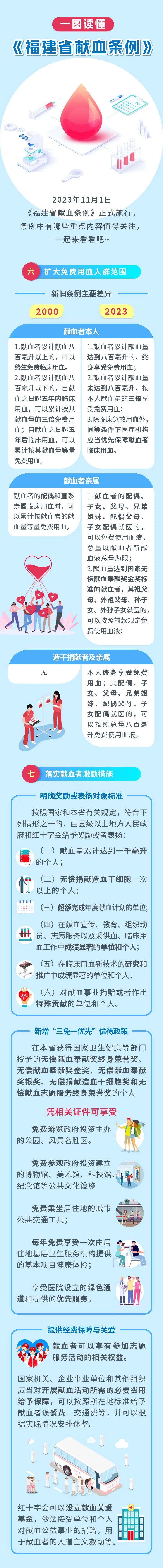 记者获悉,自2023年11月1日起施行的《福建省献血条例》强化政府主体责任,提升社会参与,优化献血点布局,完善激励措施。目前,在福建省获得国家无偿献血奉献奖终身荣誉奖、金奖、银奖以及无偿捐献造血干细胞奖、无偿献血志愿服务终身荣誉奖的个人,可享受“三免一优先”政策:免门票游览政府投资主办的景区、场馆;免费乘坐城市公共交通工具;每年一次免费基本健康体检;在医疗机构享受绿色通道与优先服务。