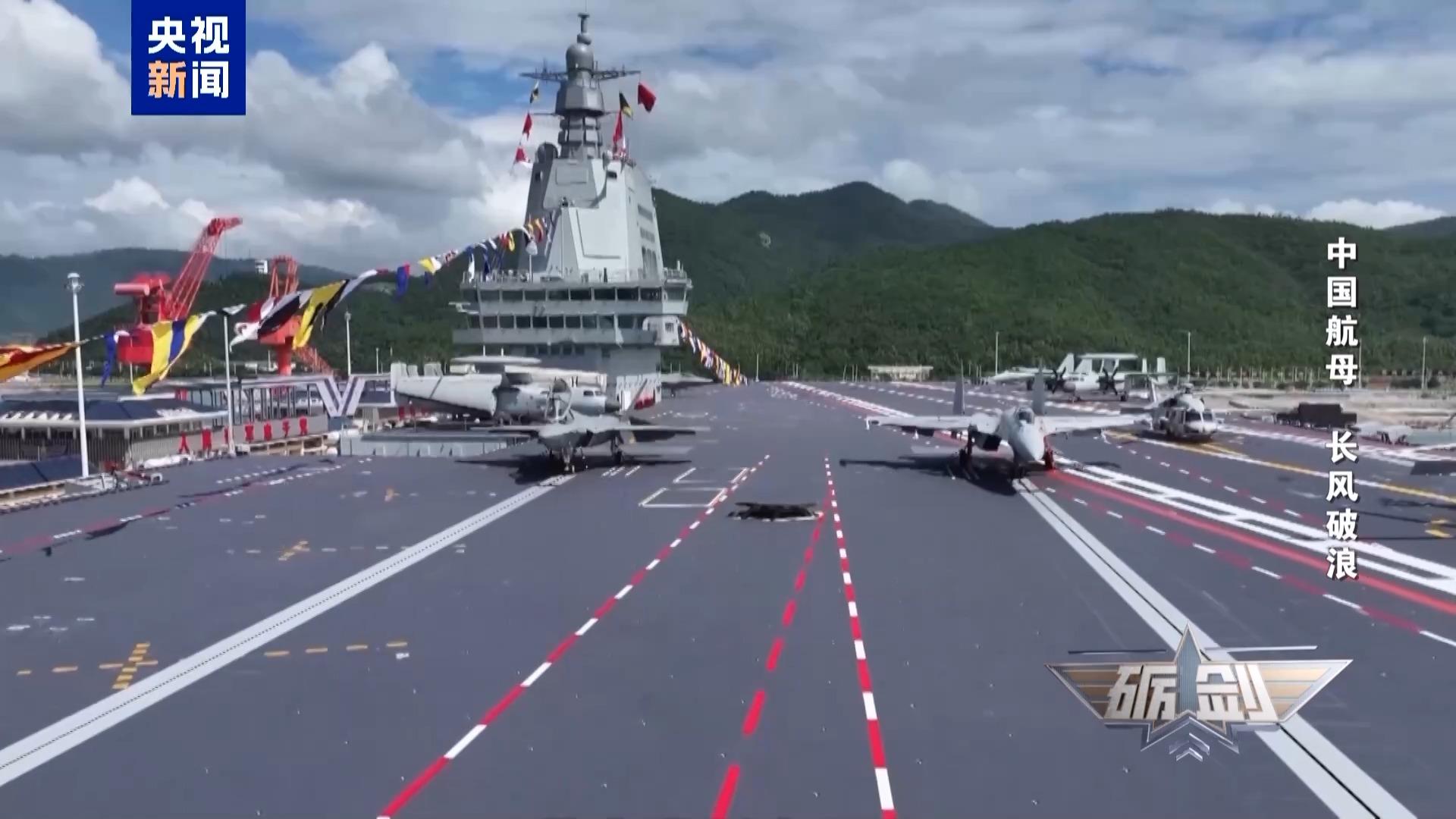 宽阔的飞行甲板上,4道阻拦索、3个弹射起飞位格外醒目,歼-35、歼-15T、空警-600等新型舰载机依次停放。