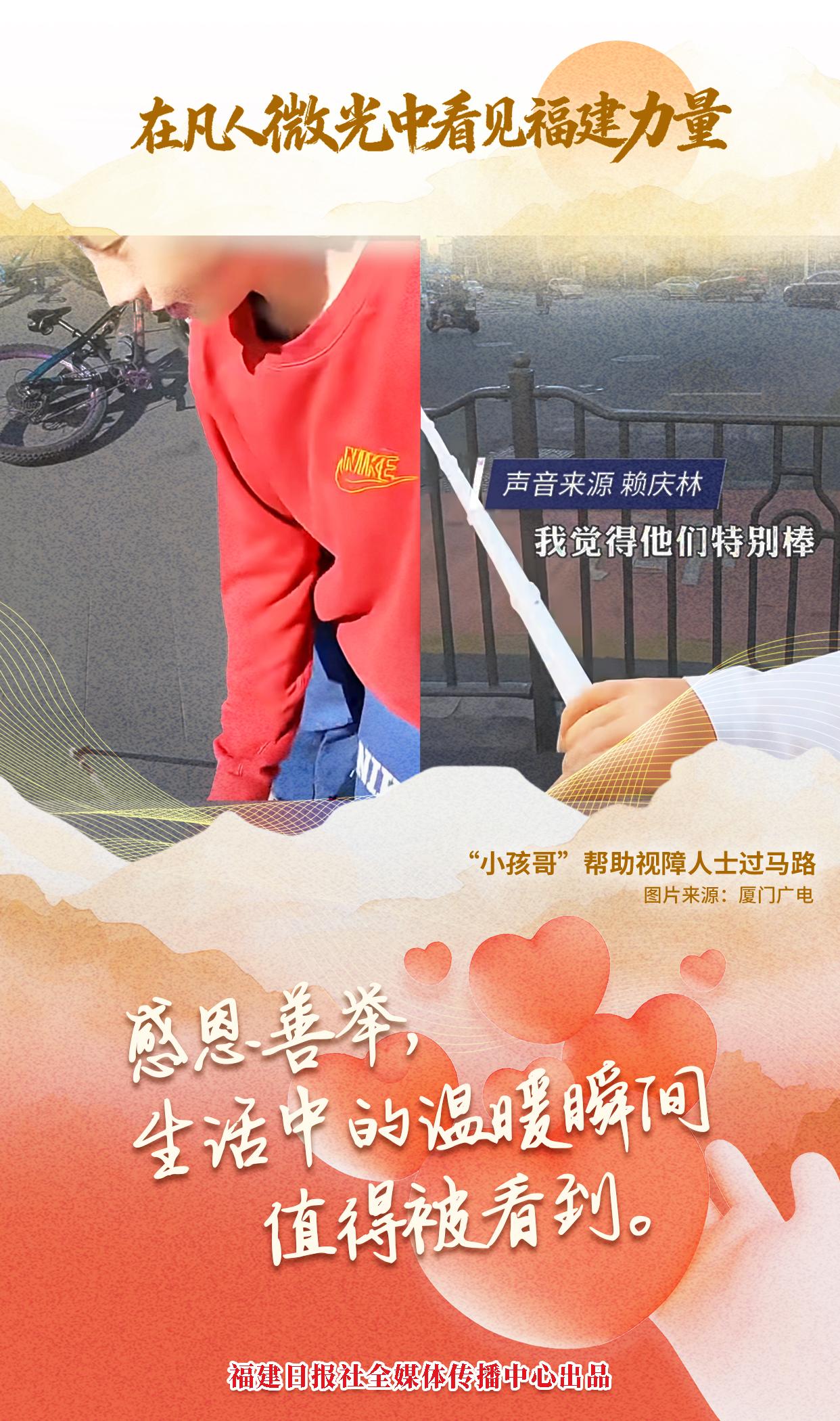 视障人士赖庆林在短视频平台发布了12月7日在厦门湖光路口获三名少年热心相助的视频。视频发出后,网友们纷纷为“小孩哥”们的暖心举动点赞,原始视频浏览量已超过百万。
