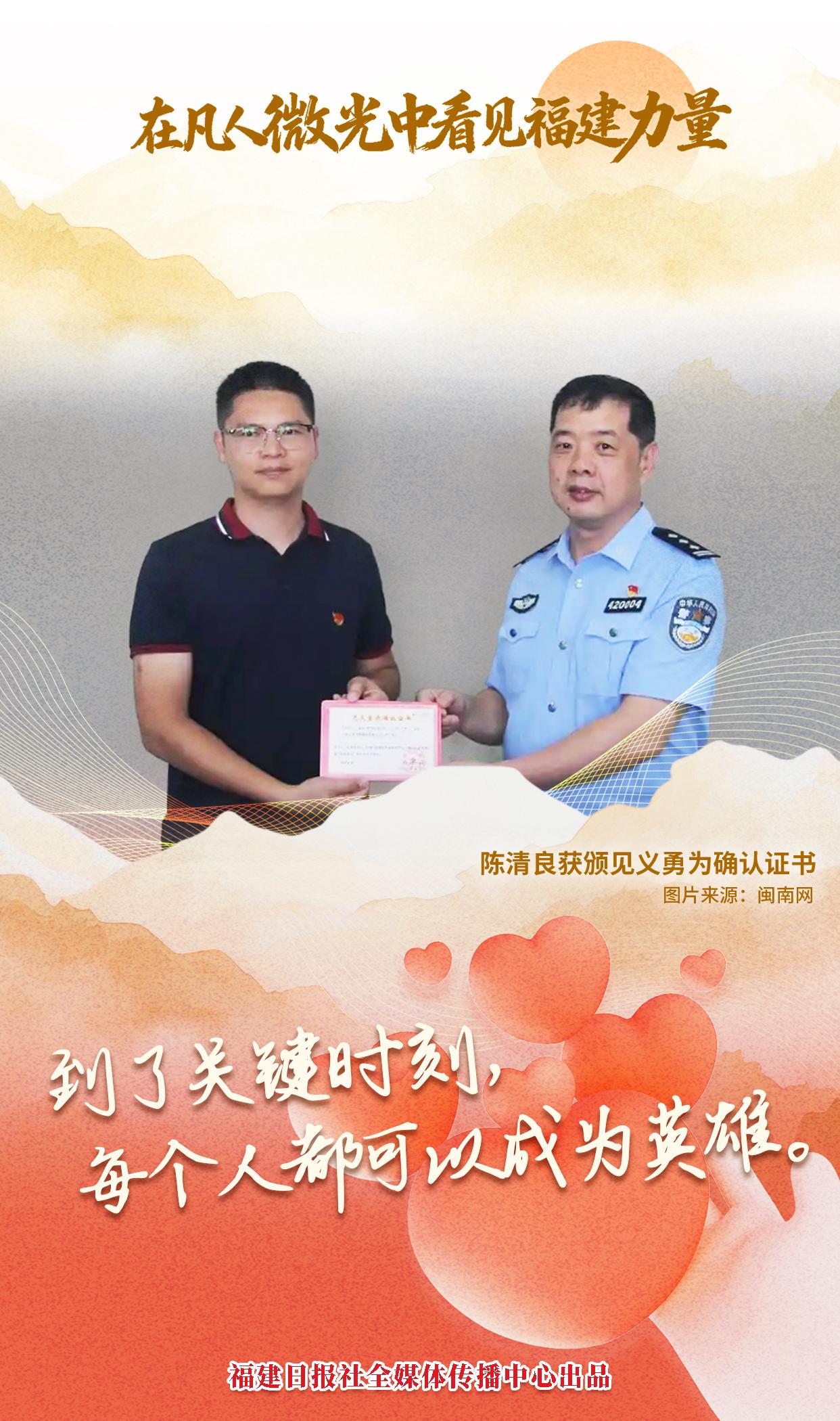 6月,泉州公安丰泽分局和丰泽区见义勇为协会为陈清良颁发见义勇为确认证书,及奖励金5000元。拿到奖金后,陈清良第一时间将其捐出,为青少年成长教育贡献力量。