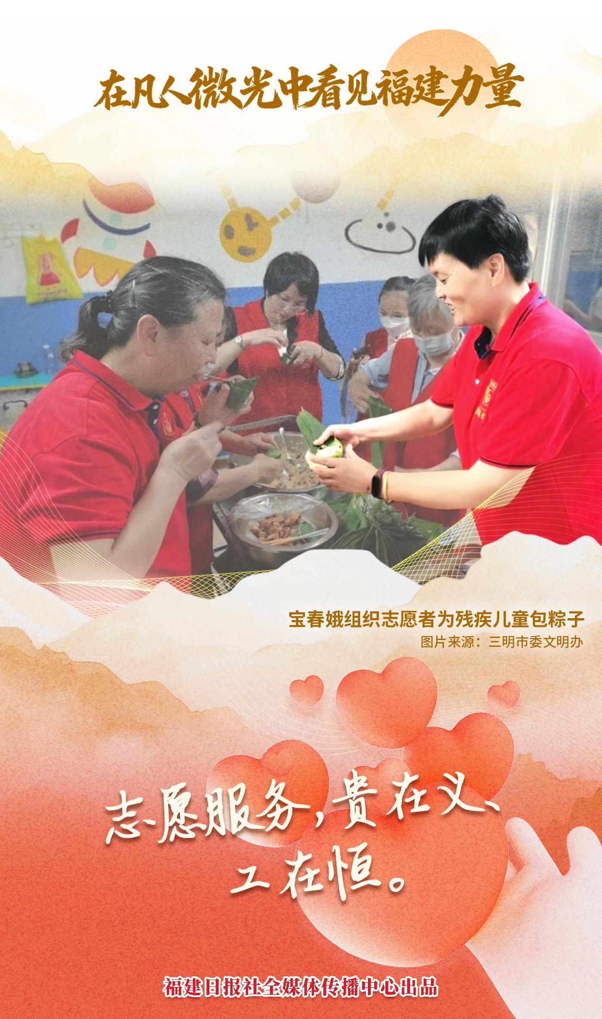 1962年出生的宝春娥,是三明市三元区老年大学九九志愿服务队的队长。她以退休为新起点,积极参加“三明市脊髓损伤者生活重建训练营”等志愿服务;深耕党的理论宣讲事业,深入乡镇、社区、学校开展宣讲;连续多年资助困难学生完成学业等。