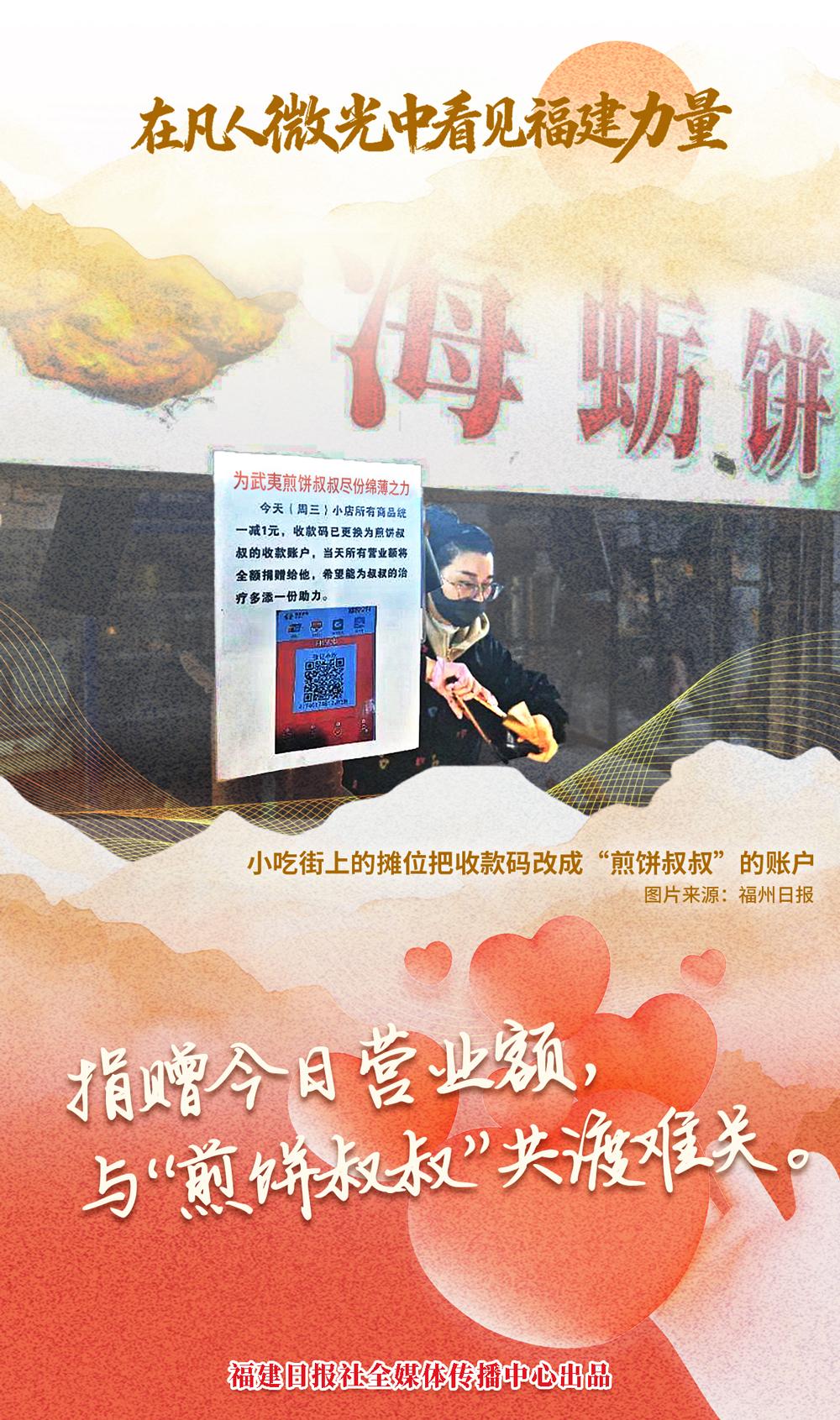 12月10日晚,福建师范大学旗山校区旁的小吃街上演了一幕暖心场景:多个摊位同步更换收款码,变成确诊癌症的煎饼摊主张建武的收款账户,摊主们以“捐赠今日营业额,与‘煎饼叔叔’共渡难关”的默契,发起了一场爱心接力。