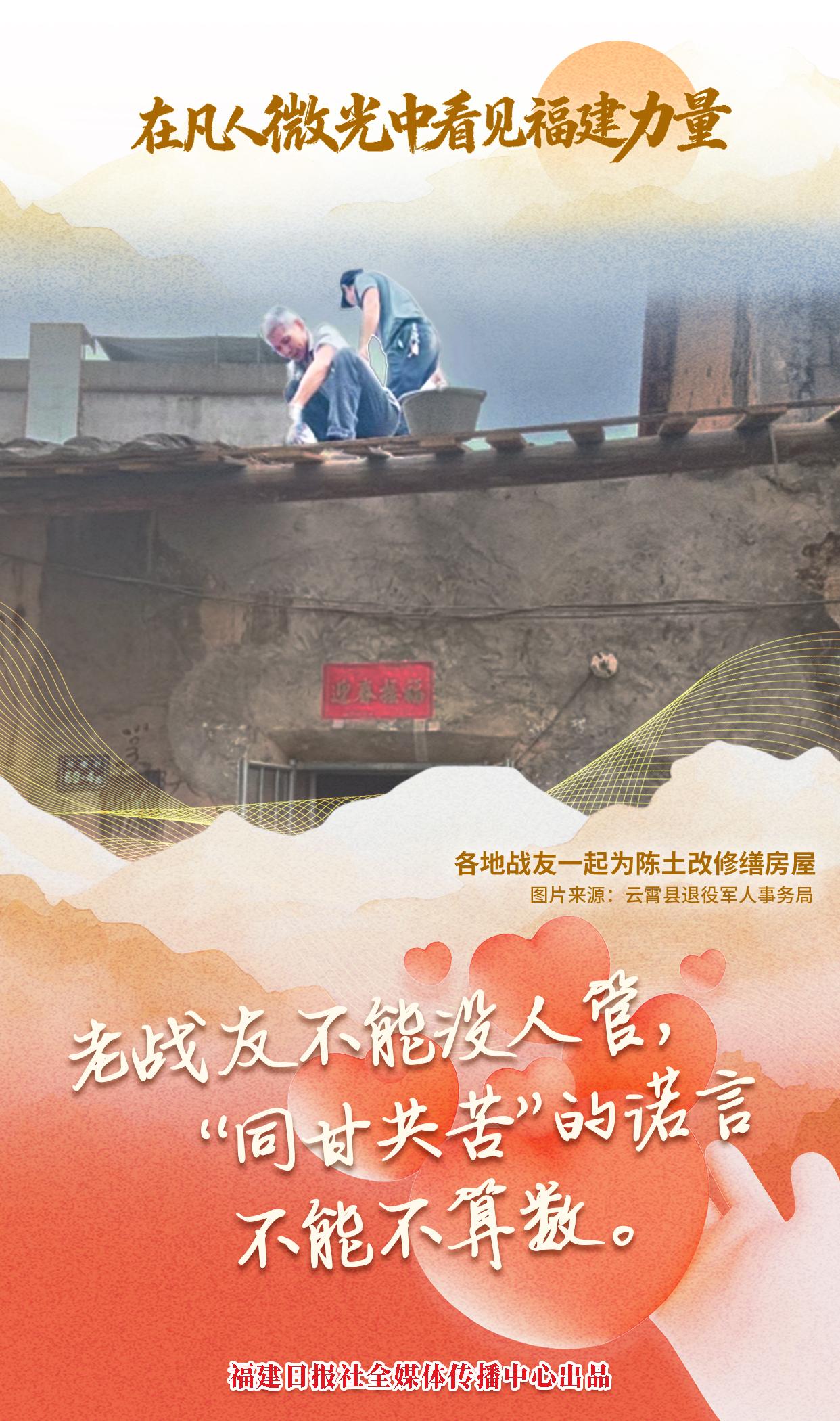 11月,漳州市云霄籍老兵张茂春在得知战友陈土改孤身一人回到家乡,建于上世纪五十年代的土坯屋住处已成危房后,当即召集分散在各地的战友,一起为陈土改修缮房屋。