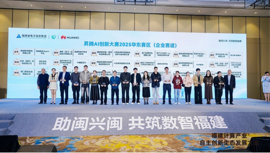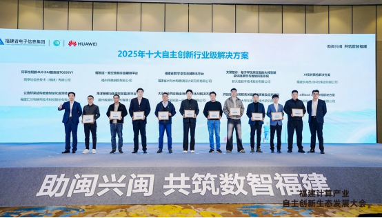 同时,福建人工智能自主创新联合体在本次大会上重磅发布了“2025年十大自主创新行业级解决方案”,方案覆盖智能制造、低空经济、水利、智慧医疗、纺织工业、基础建设、海洋生态、交通物流、智慧政务等关键领域。会上,华为福建政企业务总经理陈跃、华为福建产业发展与生态部部长段煦为10家获奖单位颁奖。