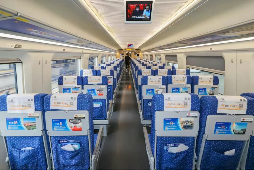 不止于列车车身醒目的“来晋江 做全球鞋纺生意”标识,车厢内的车门贴、海报、桌板壁、头枕片、LED屏、行李架等处均作标识设计;列车广播里还不时响起“欢迎您乘坐‘晋江国际鞋纺城’冠名的品牌专列.......”的温馨提示,满满的晋江鞋纺元素。